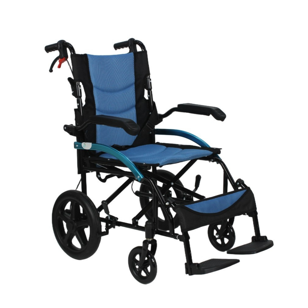 Lightweight aluminum transit chair with folding backrest, secure auto-lock brakes, fixed armrest, and flip-up footrests—ideal for safe, easy patient transport.
