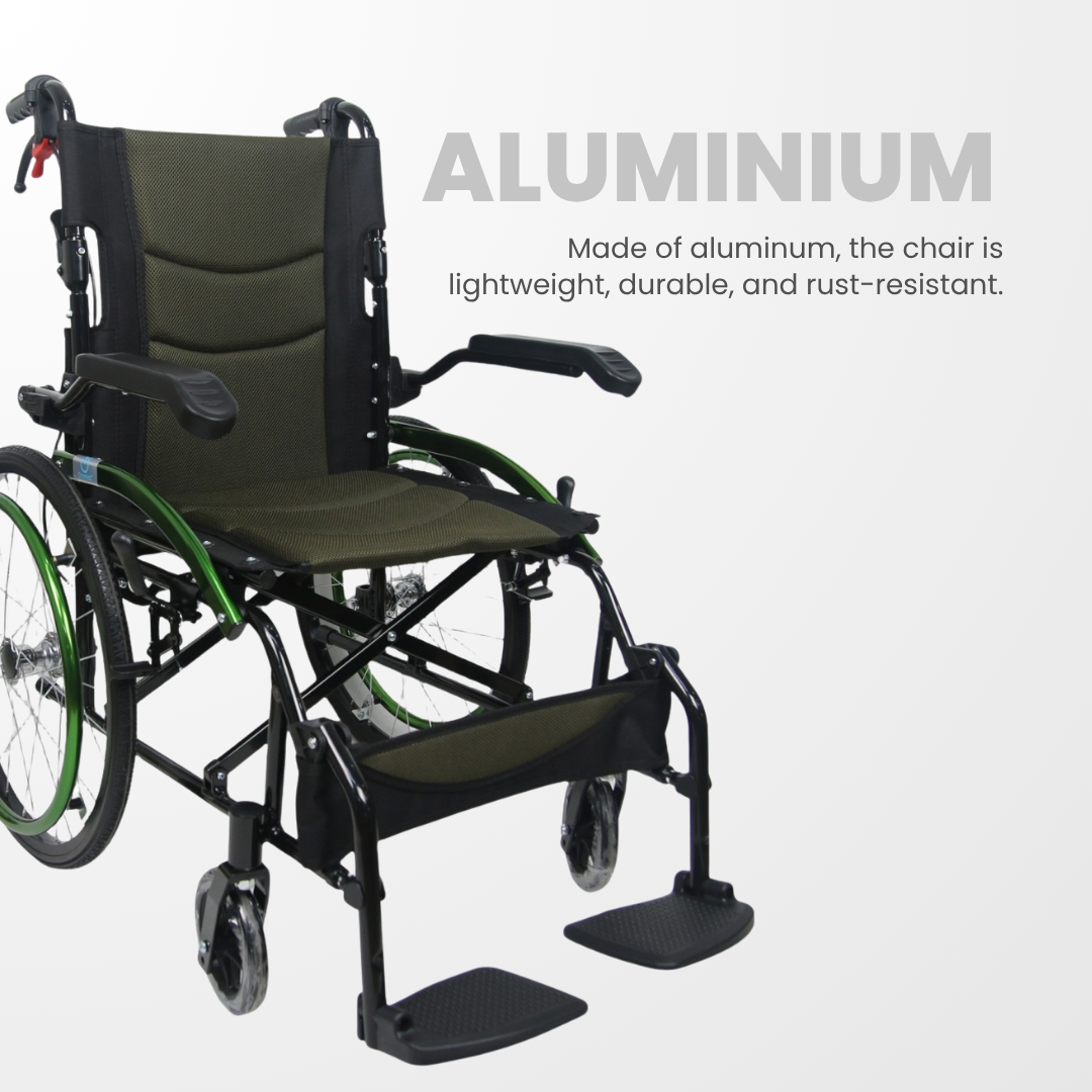 Lightweight aluminum wheelchair with folding frame, secure auto-lock brakes, and flip-up armrest/footrest ideal for safe, portable patient mobility.